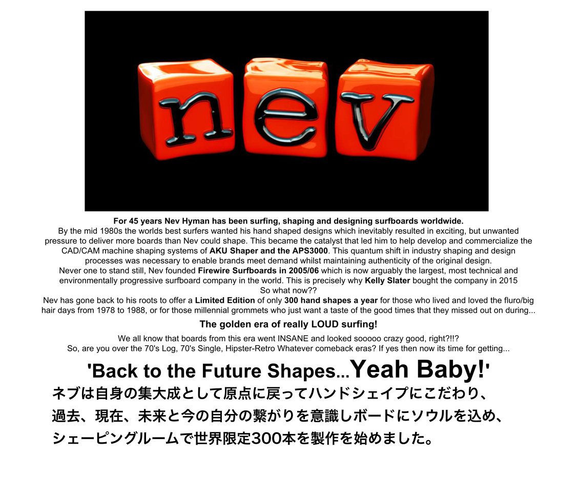 2005/2006年にハイテクノロジー、地球に優しいサーフボード ファイヤーワイヤー社を創設する。2015年にケリースレーターがそのファイヤーワイヤー社を買収した。今現在ネブは、彼自身の集大成として原点に戻っている。ハンドシェイプにこだわり、過去、現在、未来と今の自分の繋がりを意識しながら、1978から1988年のレプリカを全てを、その時代の道具を使い、一本一本のサーフボードにソウルを込め、自宅のシェーピングルームで世界限定300本を製作中。派手な板がトレンドだったサーフィン黄金時代。この時代のサーフボードは見た目がとても派手でクレイジーボード旋風が吹き荒れていた事はみんな記憶に残っているだろう。もし70年代のロングボードやシングルフィンなどの次のトレンドに乗りたいなら、パイオニアであるNevの80’sのサーフボードがお勧めである。